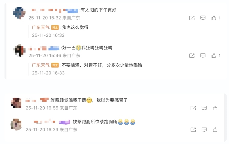 不少网友留言表示:天气十分干燥,睡觉喉咙都干醒了;皮肤都感觉干巴巴的。