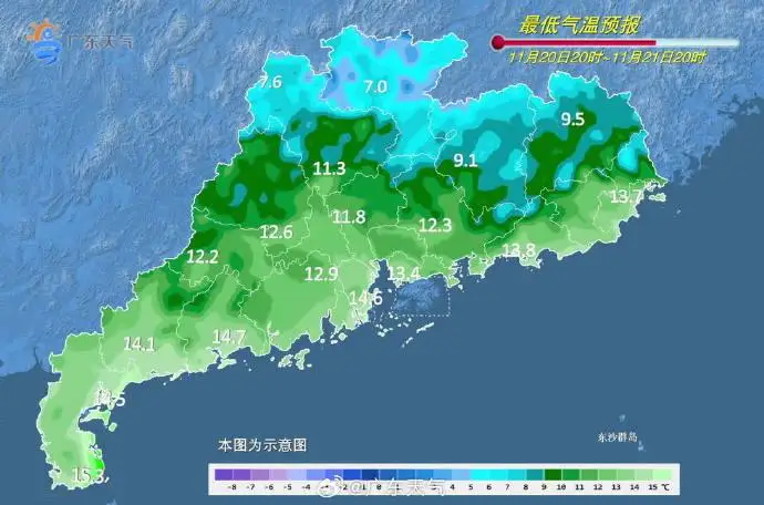 22日,全省晴到少云。昼夜温差大。最低气温:粤北市县6~9℃(高海拔山区2~5℃),南部沿海市县13~16℃,其余市县10~13℃。
